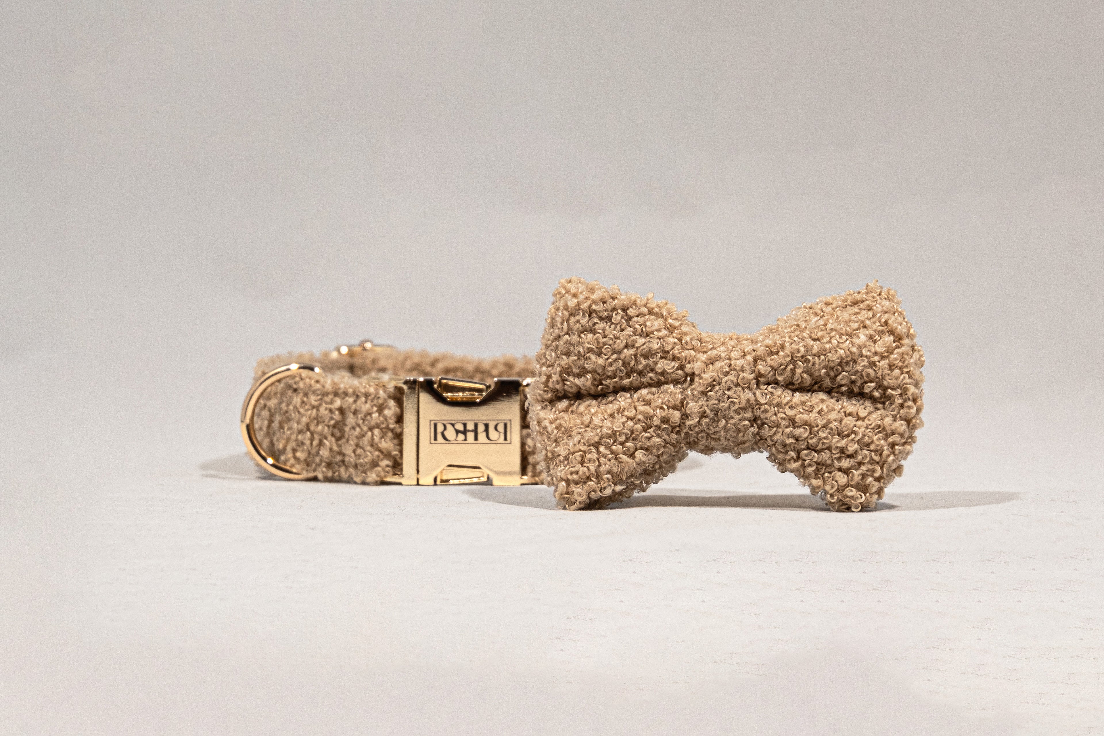 The Hazel Teddy Collar is made from soft, high quality teddy fabric designed for comfortable daily wear. The collar features a matching bowtie for a refined look and is finished with durable metal hardware in a gold tone finish.